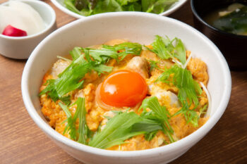 サイコー物産の広島熟成どりと向原農園の卵を使った親子丼(900円)。濃厚な味わいの卵と柔らかジューシーな鶏肉が夢の共演