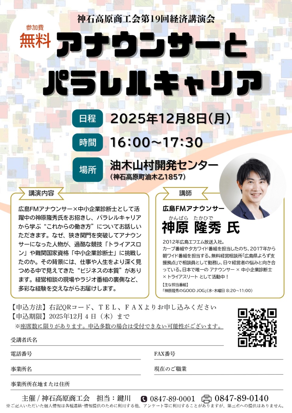 2025.11.7 神石高原 商工会 新着情報 第19回経済講演会参加者募集!(神… 2025年12月8日(月)、神石高原商工会が毎年恒例の経済講演会を開催します。講師は広島FMアナウンサーや中小企業診断士として活躍する神原隆秀氏。神原氏はアナウンサーとして朝のワイド番組を担当する一方、無料経営相談所「広島県よろず支援拠点」に相談員として勤務し、日々経営者の悩みと向き合っている異色のキャリ… 2025年12月8日(月)、神石高原商工会が毎年恒例の経済講演会を開催します。講師は広島FMアナウンサーや中小企業診断士として活躍する神原隆秀氏。…
