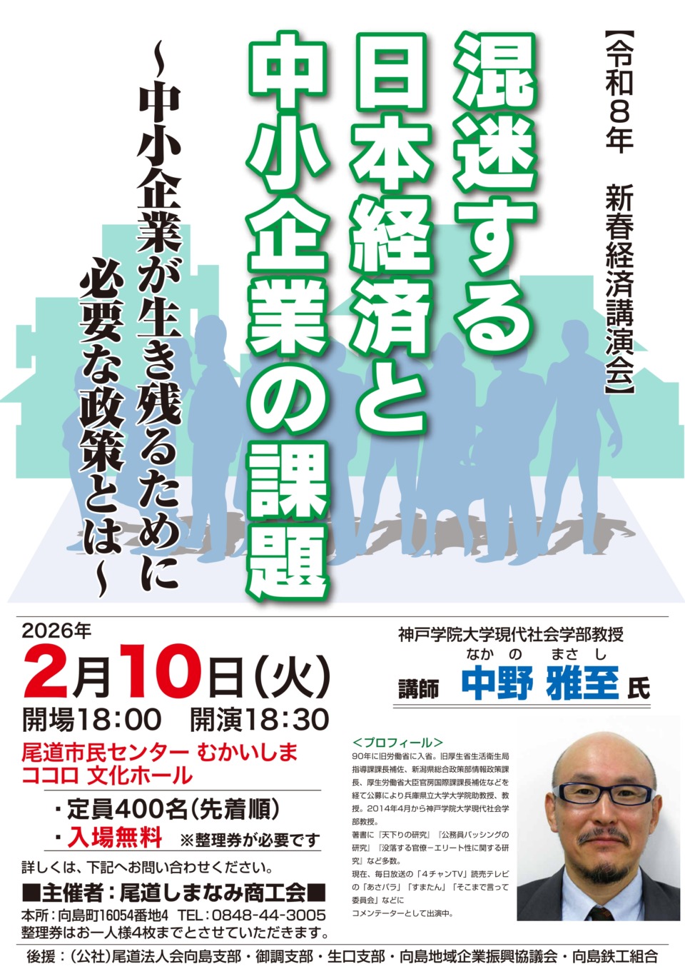 2025.12.18 尾道しまなみ 商工会 商工会からのお知らせ 「令和8年 新春経済講演会」参加者… 物価高や人手不足、先行き不透明な政策動向など、混迷を深める日本経済の中で、中小企業・小規模事業者は今、大きな転換期を迎えています。こうした状況の中、尾道しまなみ商工会が毎年恒例の新春経済講演会を開催します。神戸学院大学現代社会学部教授の中野雅至氏を講師に迎え、「混迷する日本経済と中小企業の課題」をテーマに… 物価高や人手不足、先行き不透明な政策動向など、混迷を深める日本経済の中で、中小企業・小規模事業者は今、大きな転換期を迎えています。こうした状況の中…