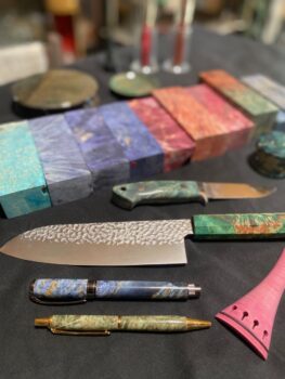 スタビライズドウッドを使用した商品たち。木の温もりはそのままに、デザイン性や高級感を高めます