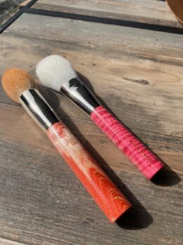 24季の事業は、樹脂含浸材(スタビライズドウッド)の「素材供給」が中心です。完成品は、全国規模のイベント出展やECサイトで発信しています。今年9月には熊野筆メーカーの「晃祐堂」とコラボが実現し、木材に県内産のモミジを使用した化粧筆も誕生しました。紅葉をイメージしたカラーは目を引く美しさで、伝統的な技術と新たな技術が合わさった唯一無二の商品になっています。