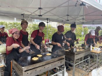 「お好み焼のらやま」のスタッフと生徒のみなさん。アツアツの鉄板の前で、懸命にお好み焼を焼き続けました