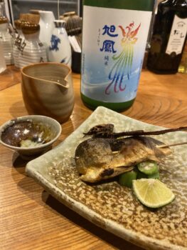 食事ができるコースに登場した焼き鮎は一夜干しにしてうま味を凝縮した逸品。メニューは季節ごとに変更します